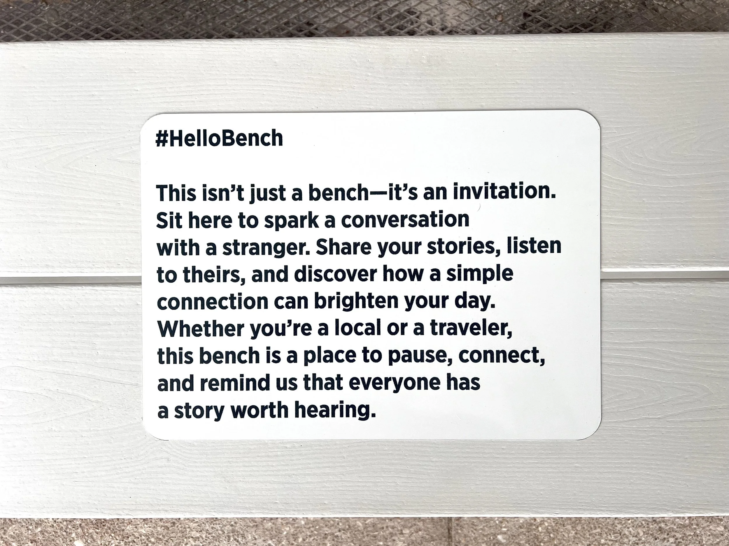 A guerrilla-style community art experiment designed to ease loneliness and spark connection between strangers. Installed on the Lockhart town square — a hub of daily foot traffic and visiting tourists — the single bench features a discreet plaque with simple instructions inviting anyone to sit, start a conversation, and share a story. What began as one ordinary seat became an unexpected catalyst for human connection. A low-tech solution for high-speed disconnection.